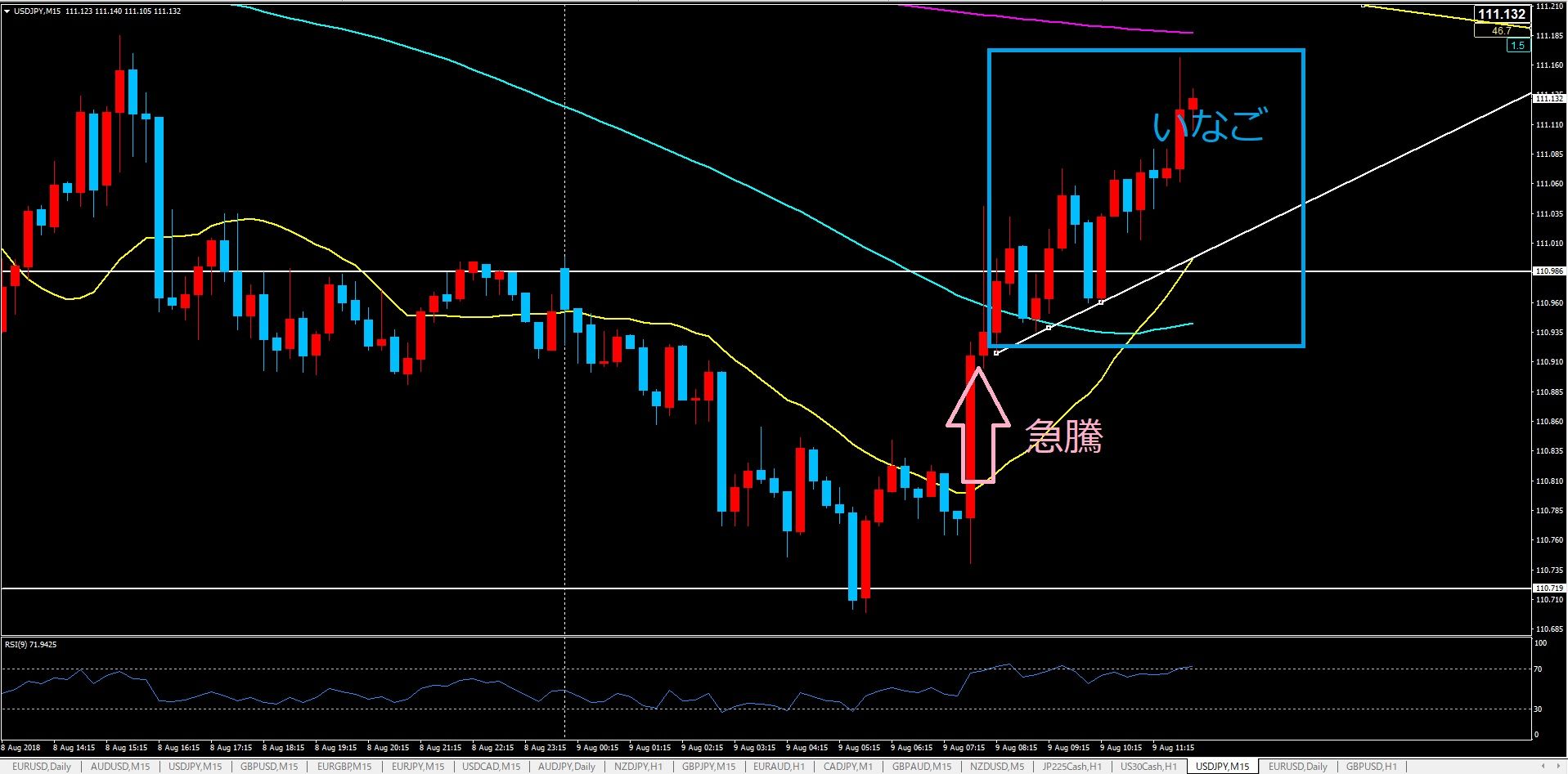 ここから更に角度のキツイ切り上げラインが出てくるか、それともオレンジの切り上げラインを下抜けて下がっていくのかはわかりませんが、オレンジの切り上げラインを下抜けても15分足で引いた白い切り上げライン(いなごライン)がサポートしてしまうかもしれませんので利確目標はそこまでとなってしまいます。